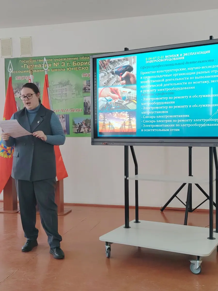 Выбор будущей профессии всегда волнителен. Чтобы помочь нашим учащимся выпускных классов определиться с выбором дальнейшего пути, 22.04.2026 гимназию посетили преподаватели УО «Жодинский государственный политехнический колледж». Для учащихся была проведена заочная экскурсия по колледжу. Ребята узнали о специальностях, квалификациях, которые можно получить в коллежде. Учащиеся 9-х х классов смогли задать интересующие вопросы: сложно ли учиться, предоставляется ли общежитие и какие перспективы открываются после получения диплома. Такие встречи помогают понять, что престижная профессия и успешная карьера начинаются с правильного выбора учебного заведения. Благодарим Жодинский государственный политехнический колледж за продуктивное общение!