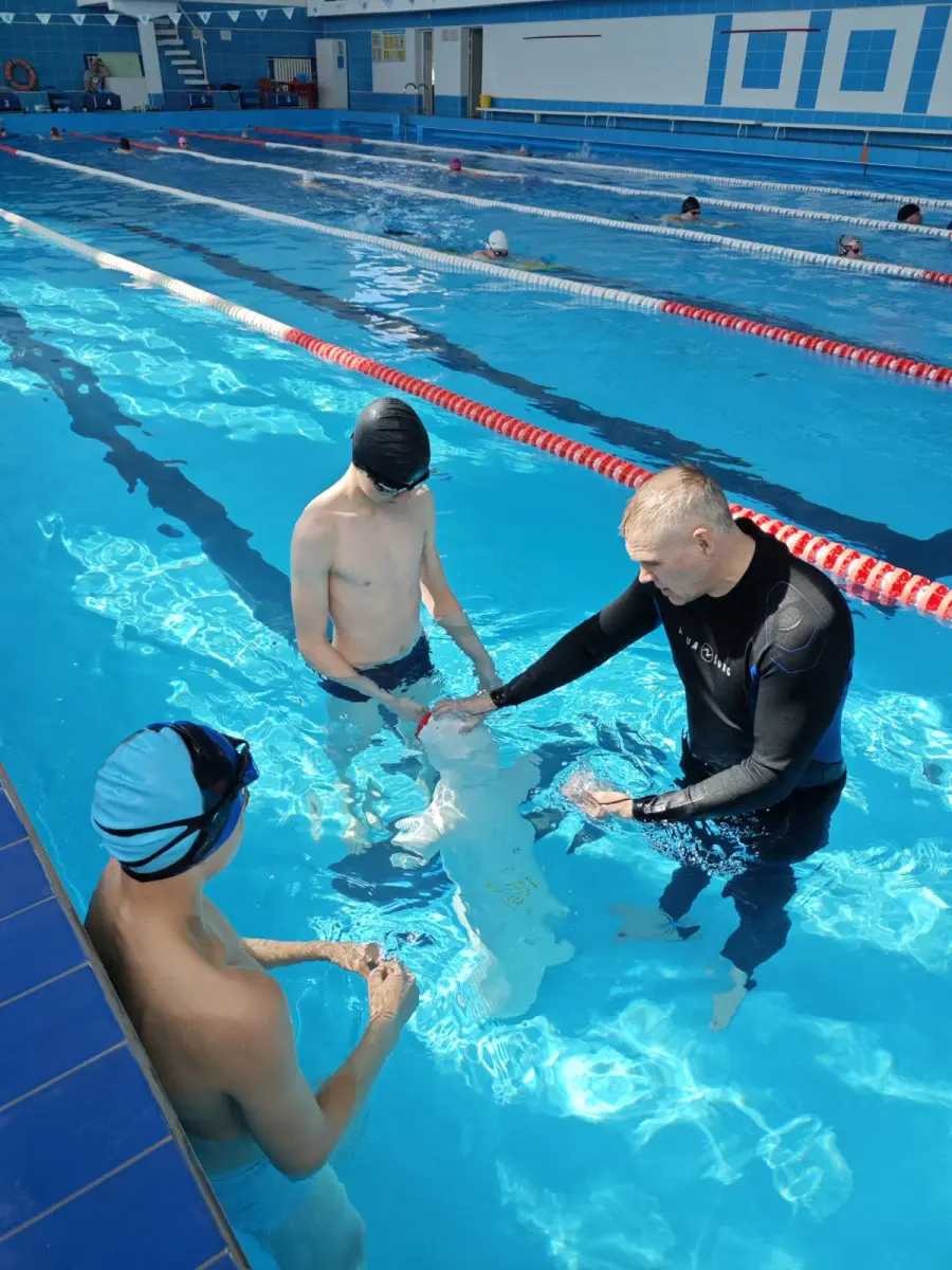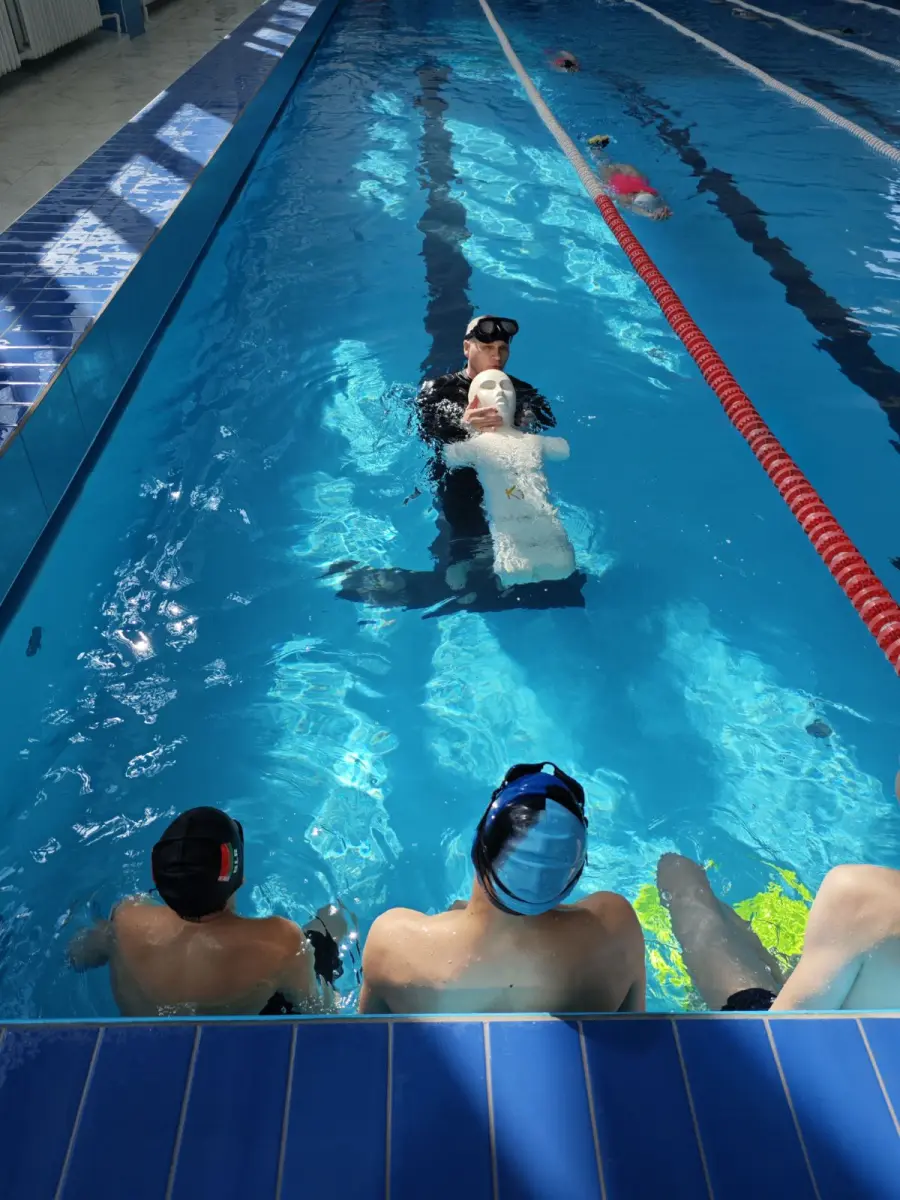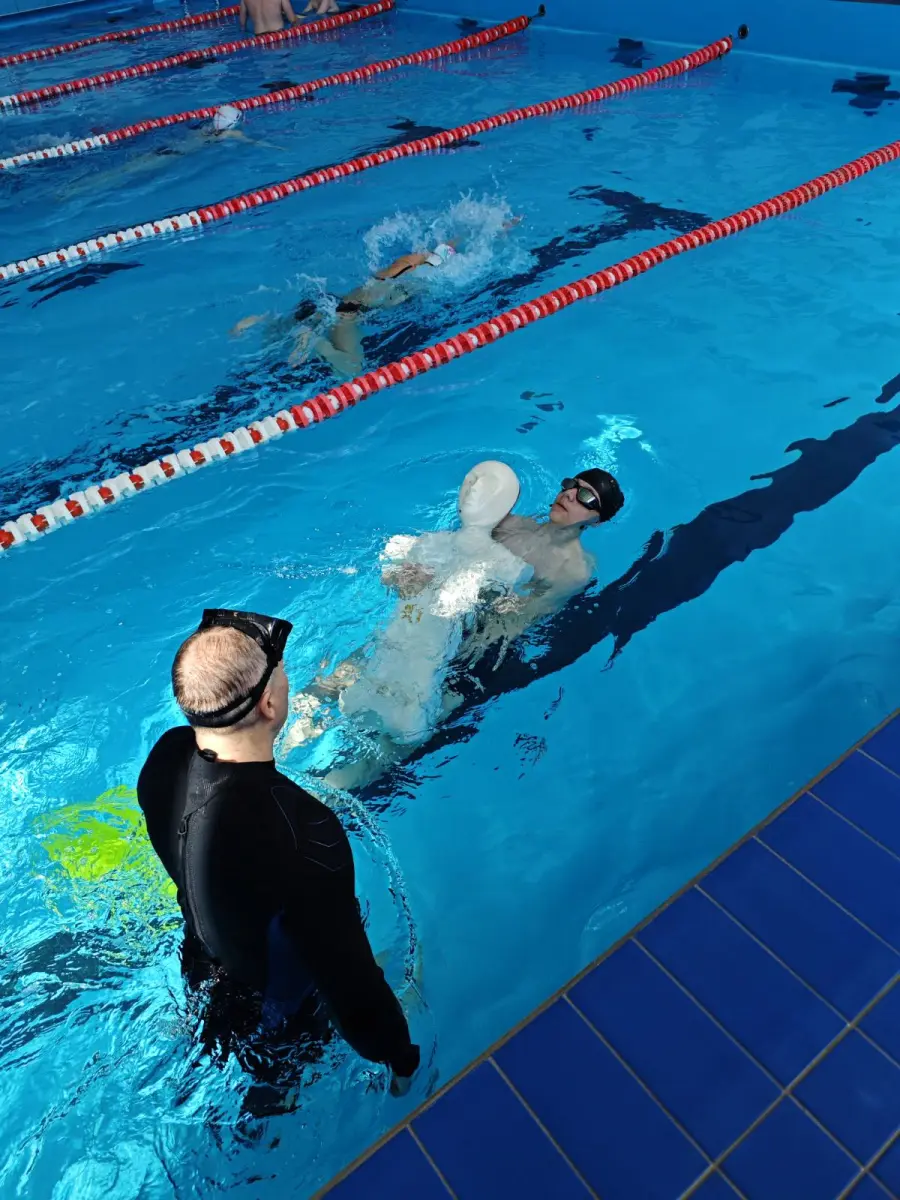Очередное обучающее занятие по спасению утопающих прошло на базе Дома спорта совместно со спасателями и класса ОСВОД гимназии. Наши гимназисты отрабатывали свои навыки в бассейне на манекене, который был достаточно тяжёлый и имитировал вес человека. Инструктор со спасательной станции объяснил ребятам какие бывают виды утопления и их признаки, рассказал, как распознать тонущего человека.