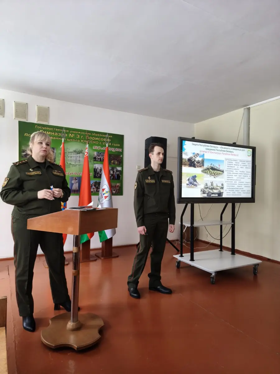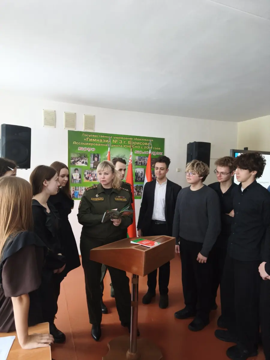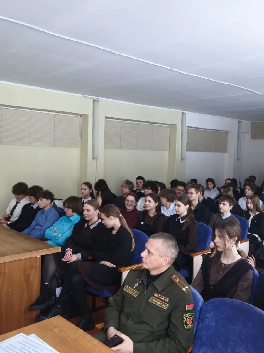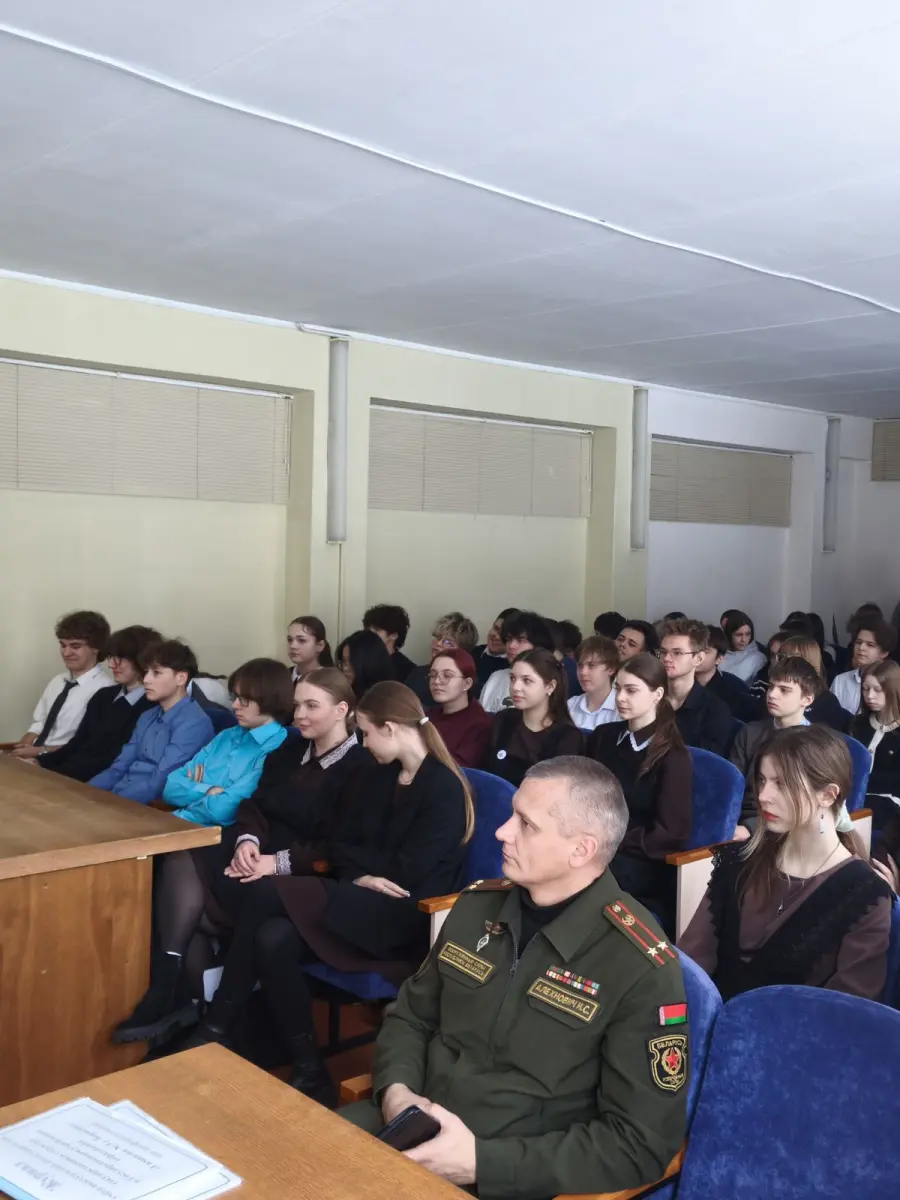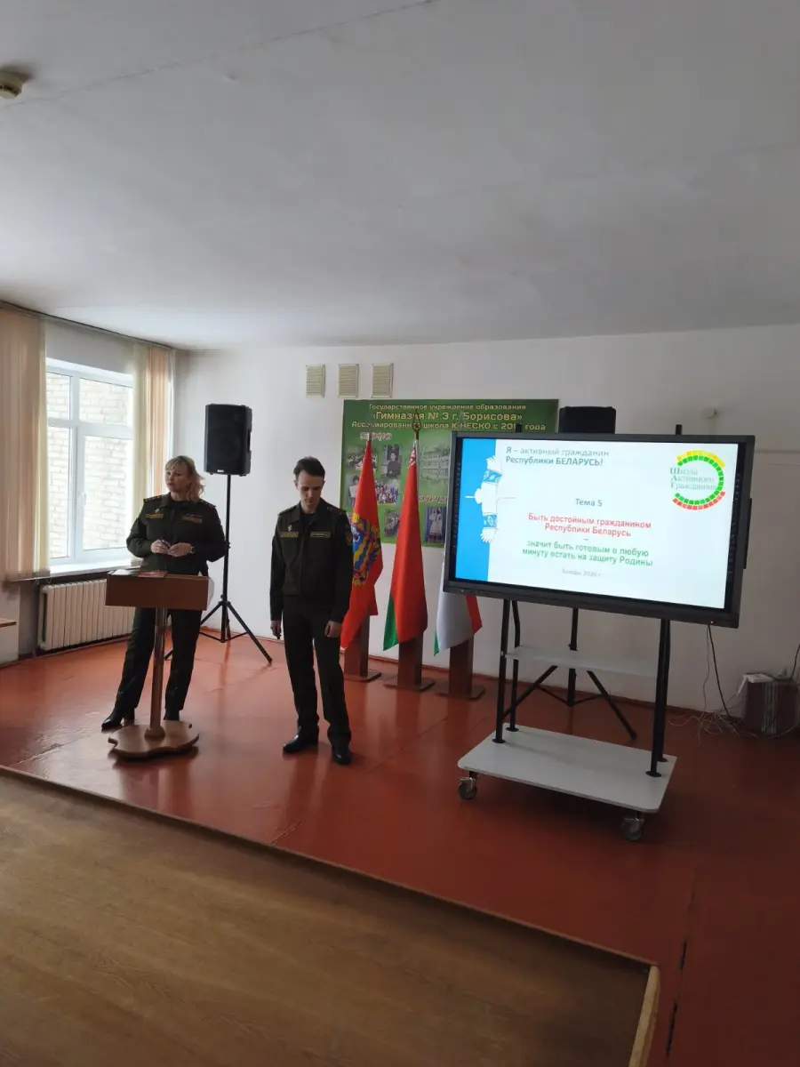 29 января 2026 года в гимназии в рамках проекта "Школа активного гражданина" прошел информационный час на тему "Быть гражданином Республики Беларусь - значит быть готовым в любую минуту встать на защиту Родины". На встречу были приглашены Алехнович И. С., заместитель командира по ИР814ЦТСКО, Алехнович М.К., зам.КБ814УТехО, Островский Н.С, офицер группы 291ЦО4Б. Мероприятие прошло в формате диалога. Были обсуждены вопросы, как в РБ обеспечивается обороноспособность страны, что свидетельствует о надёжный защите границы нашей страны.