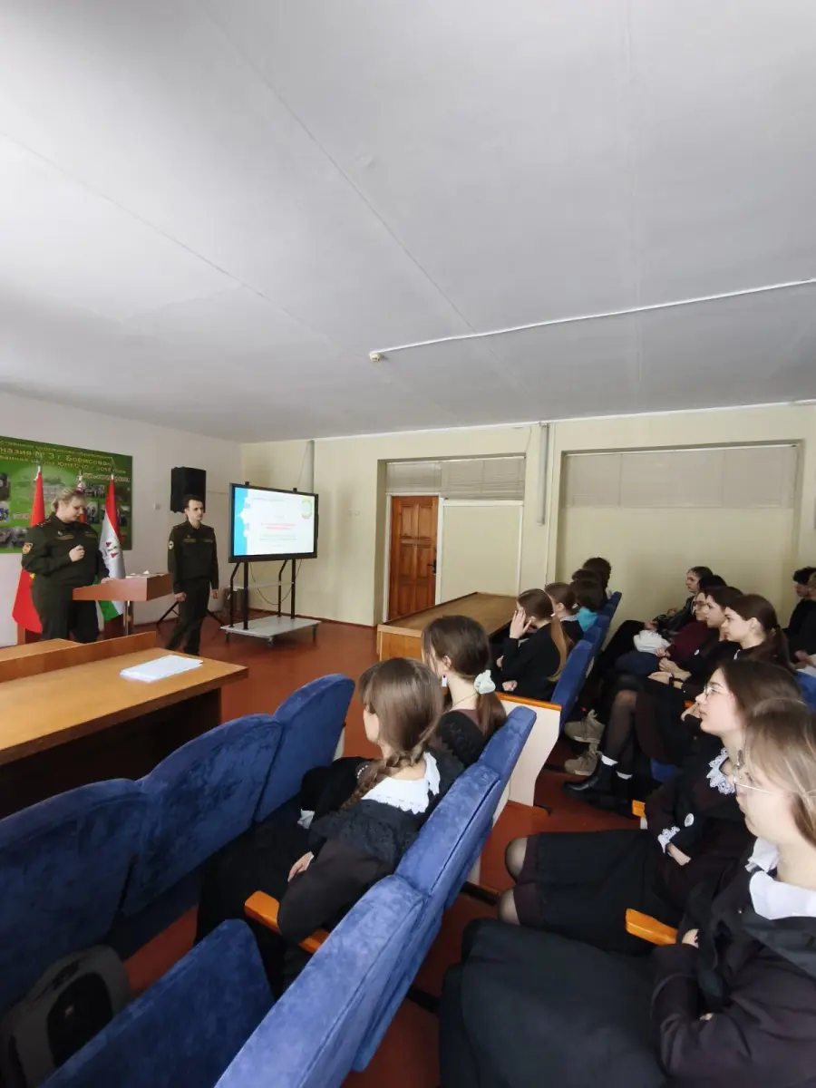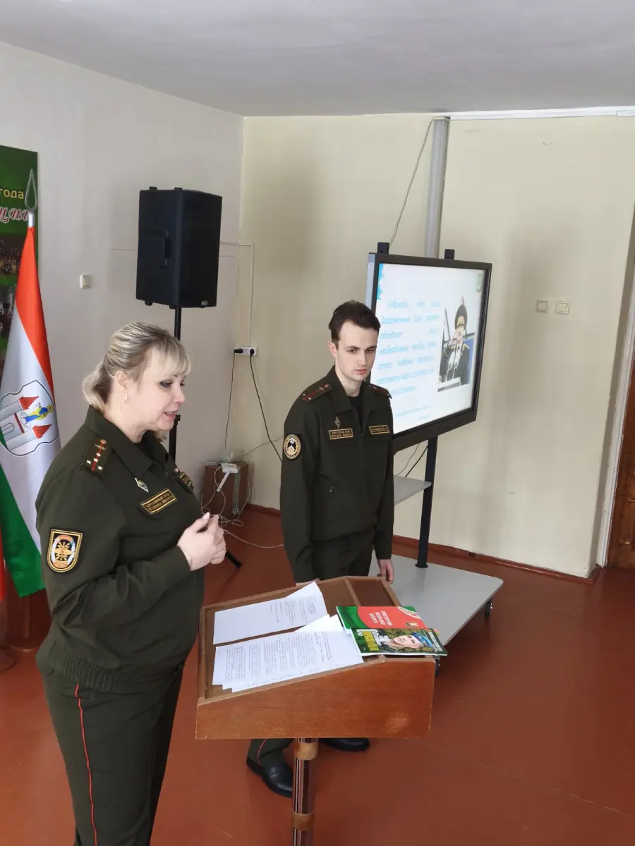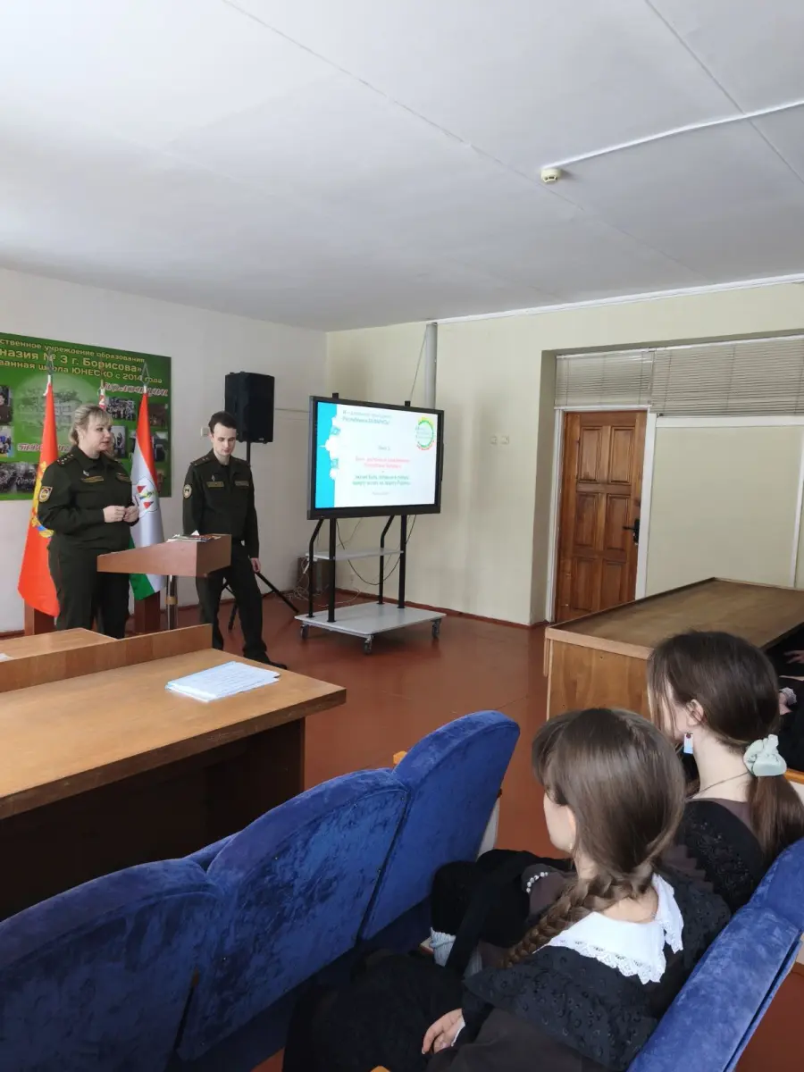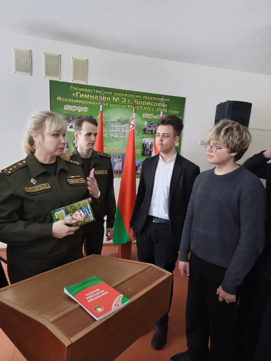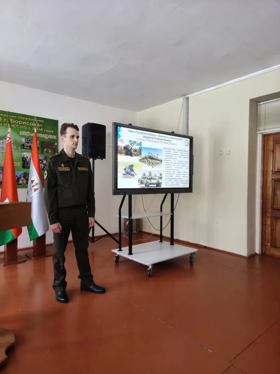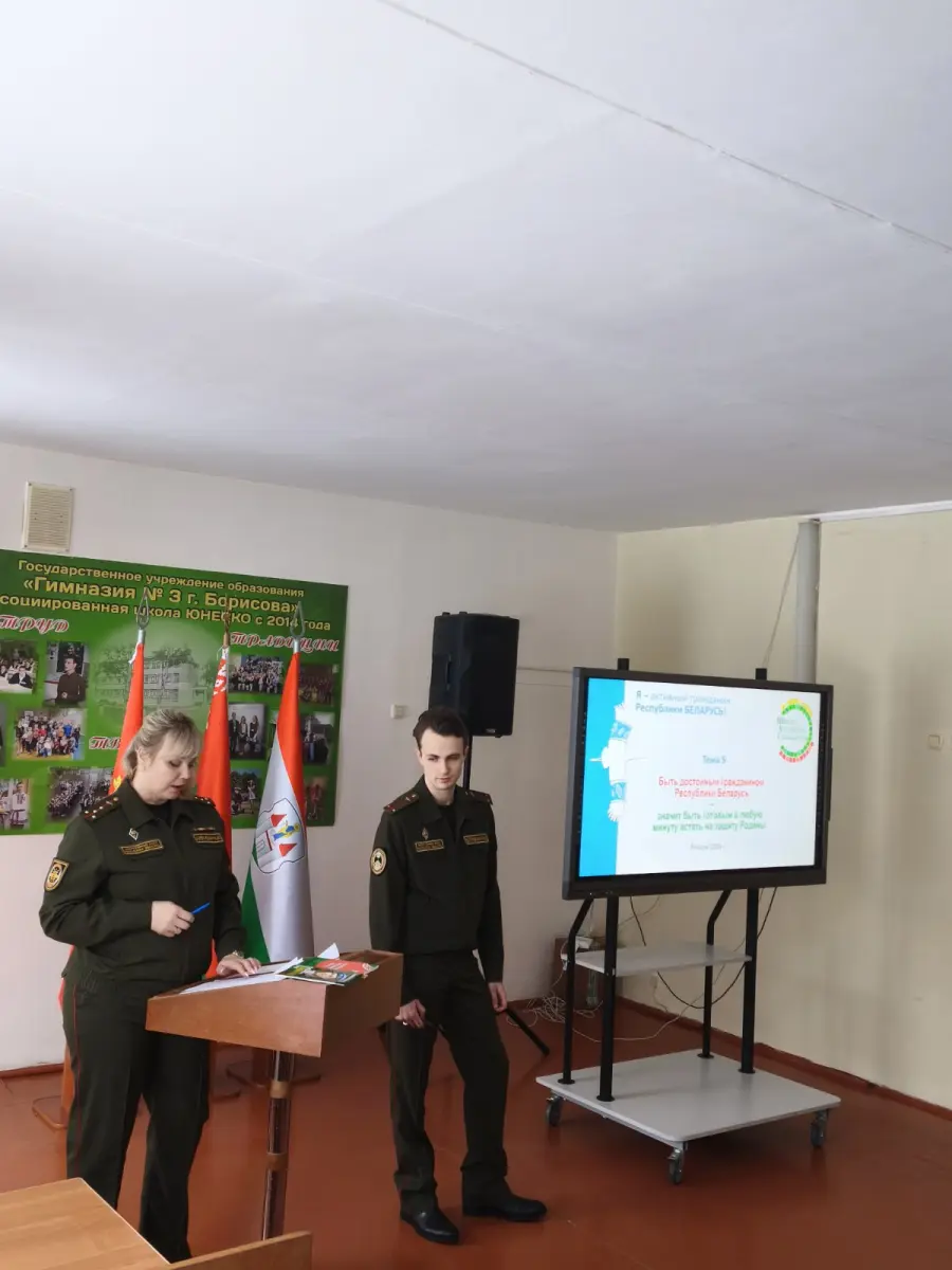 29 января 2026 года в гимназии в рамках проекта "Школа активного гражданина" прошел информационный час на тему "Быть гражданином Республики Беларусь - значит быть готовым в любую минуту встать на защиту Родины". На встречу были приглашены Алехнович И. С., заместитель командира по ИР814ЦТСКО, Алехнович М.К., зам.КБ814УТехО, Островский Н.С, офицер группы 291ЦО4Б. Мероприятие прошло в формате диалога. Были обсуждены вопросы, как в РБ обеспечивается обороноспособность страны, что свидетельствует о надёжный защите границы нашей страны.