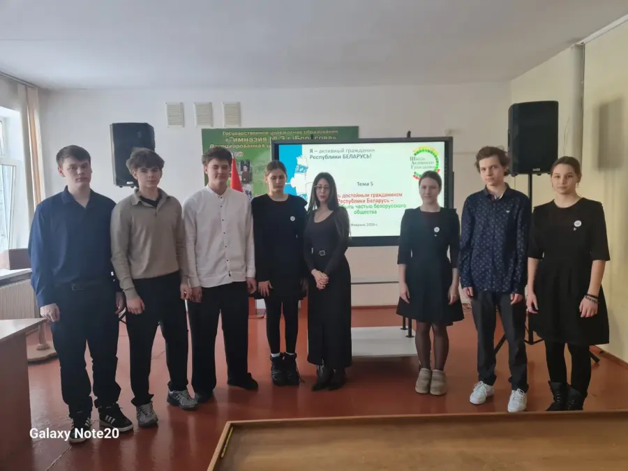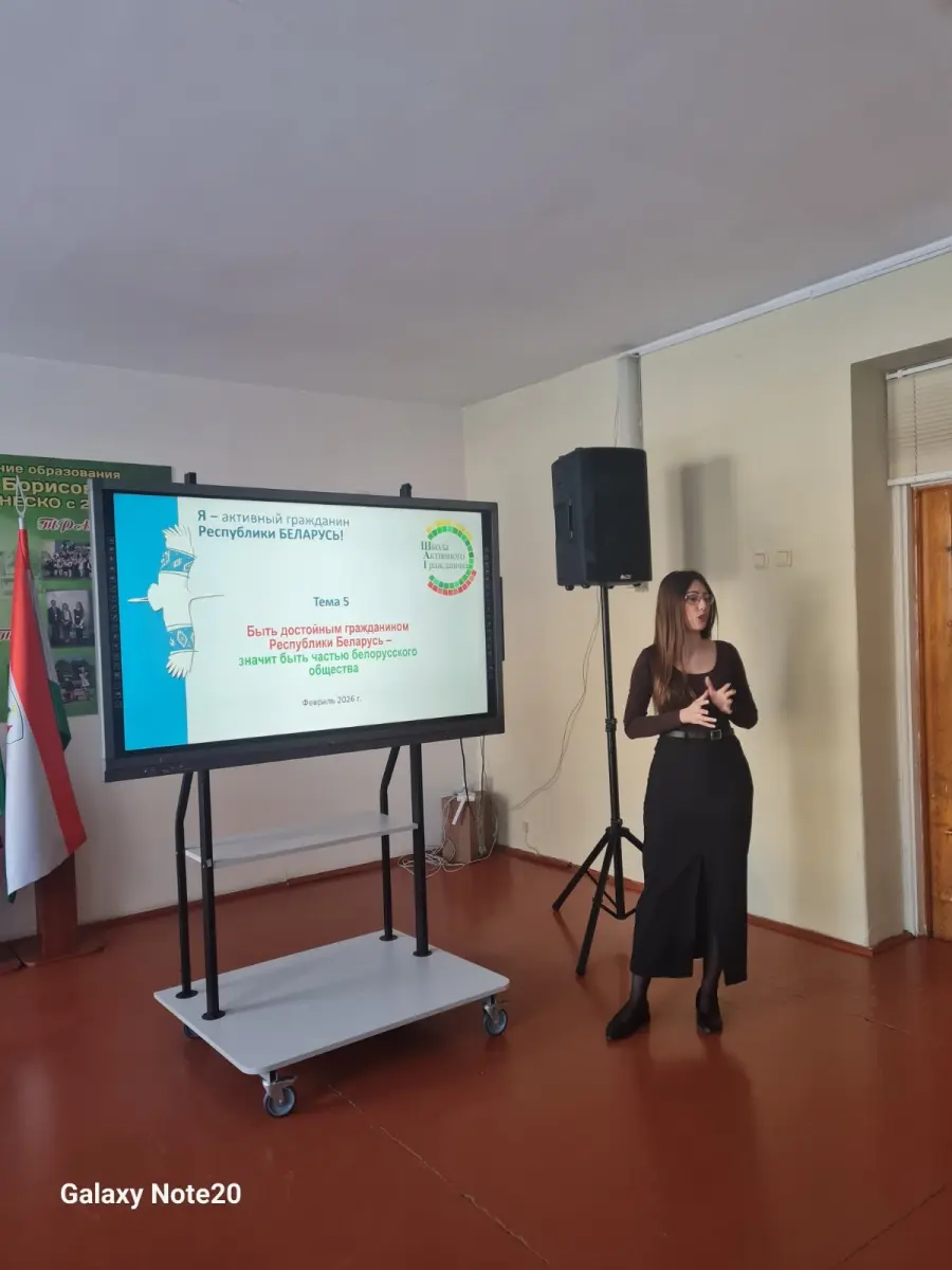 26 февраля 2026 года в гимназии в рамках проекта "Школа активного гражданина" прошел информационный час на тему "Быть достойным гражданином Республики Беларусь - значит быть частью белорусского общества". Выступила педагог-организатор ГУО "Гимназия № 3 г. Борисова" Шаркунова Е.А., которая рассказала о важности воспитания молодого поколения в духе патриотизма, сохранении исторической памяти белорусского народа. Будущее Республики Беларусь в руках молодого поколения, только вместе мы сможем сделать нашу страну сильнее, мощнее и лучше!