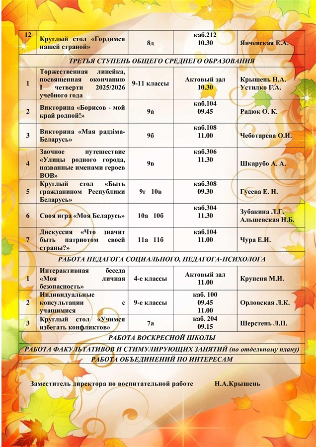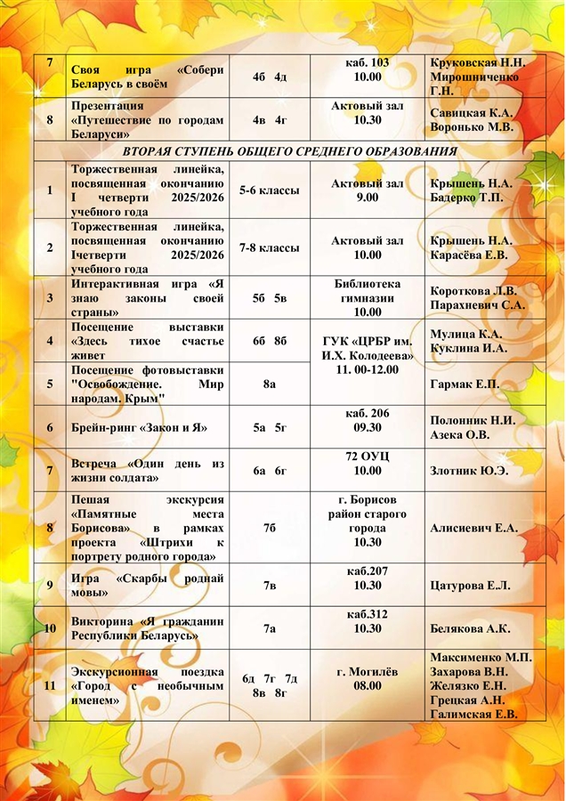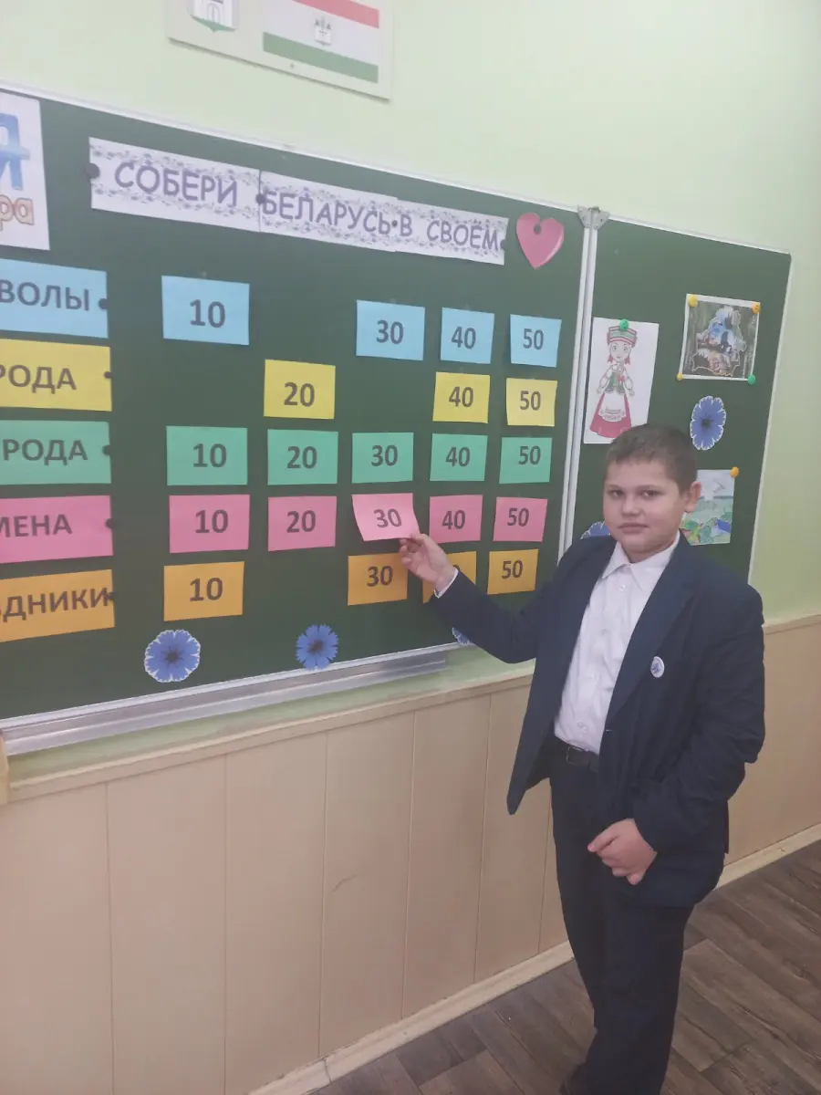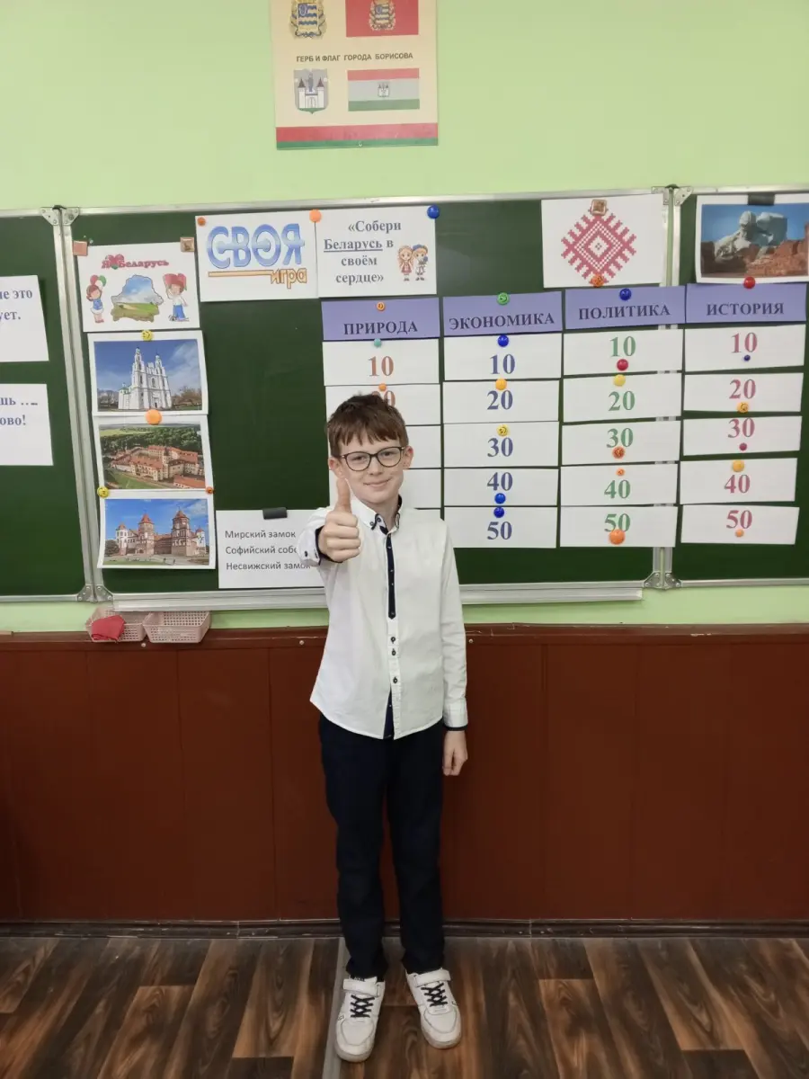 1.11.2025 г. состоялась своя игра " Моя Беларусь". Она была посвящена нашей Родине.Учащиеся 10 "А" и 10 "Б" классов, команды " Лирики" и " Физики", выбирали вопросы различной категории сложности и разной стоимости: " Беларусь от " А" до"Я", " Города Беларуси", "Известные бренды", " Знаменитые личности", "Знакомый незнакомец". Игра была интересной и познавательной.