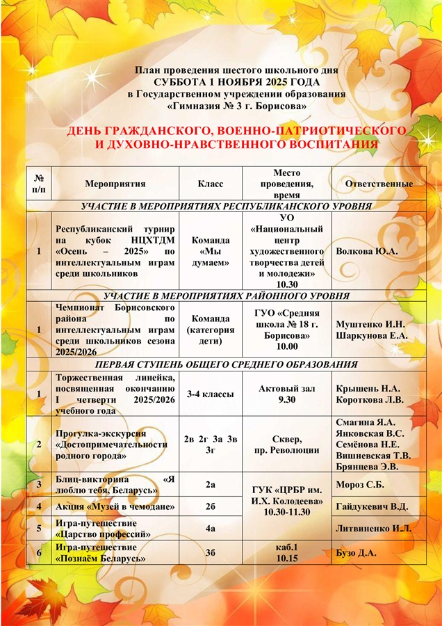 В субботу 1 ноября команда учащихся 9 "А" "Мы думаем" приняла участие в Республиканском интеллектуальном турнире "Осень-2025" в г. Минске. Ребята показали сплоченную командную игру, эрудицию и достойно представили г. Борисов на игре. Желаем нашей команде успехов на следующих турнирах.