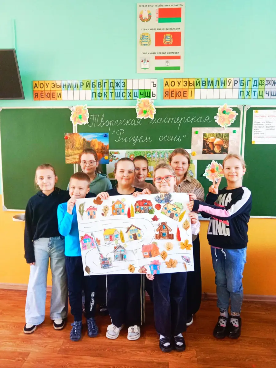 Учащиеся 3 "В" класса - "Рисуем осень". Ребята создали коллаж осеннего города, вспомнили ПДД