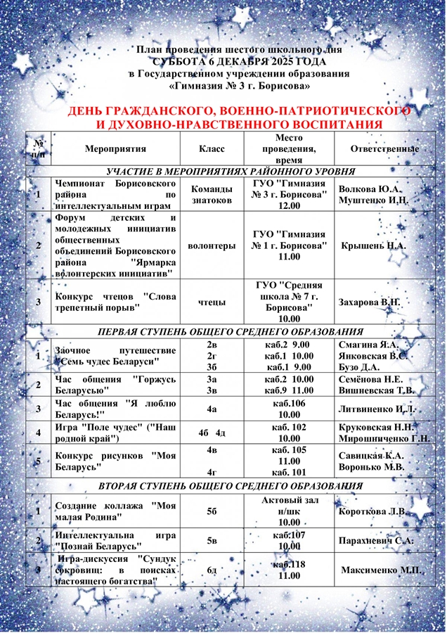 6 декабря в рамках шестого школьного дня состоялся чемпионат Борисовского района по интеллектуальным играм. Команды нашей гимназии принимали участие в играх. Результаты третьего тура БРЧИИ сезона 2025-2026 среди ювеналов и юниоров.