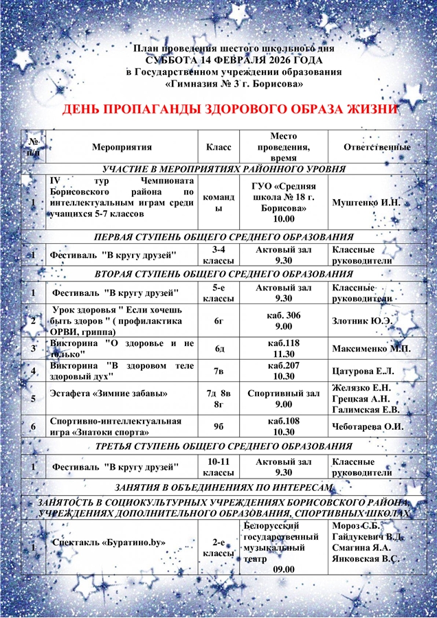 В субботу 14 февраля в Государственном учреждении образования "Гимназия № 3 г. Борисова" прошла первая часть фестиваля "В кругу друзей". Участвовали учащиеся с 1-ых по 11-ые классы. Ребята передали всем присутствующим огромный заряд энергии. В стороне не остались и родители. Именно они пришли не только поддержать юные дарования, но и принять участие в фестивале. Всем участникам, ведущим и ребятам, осуществляющим техническую поддержку фестиваля, выражаем огромную благодарность и приглашаем на вторую часть нашего фестиваля. которая состоится 28 февраля 2026 года